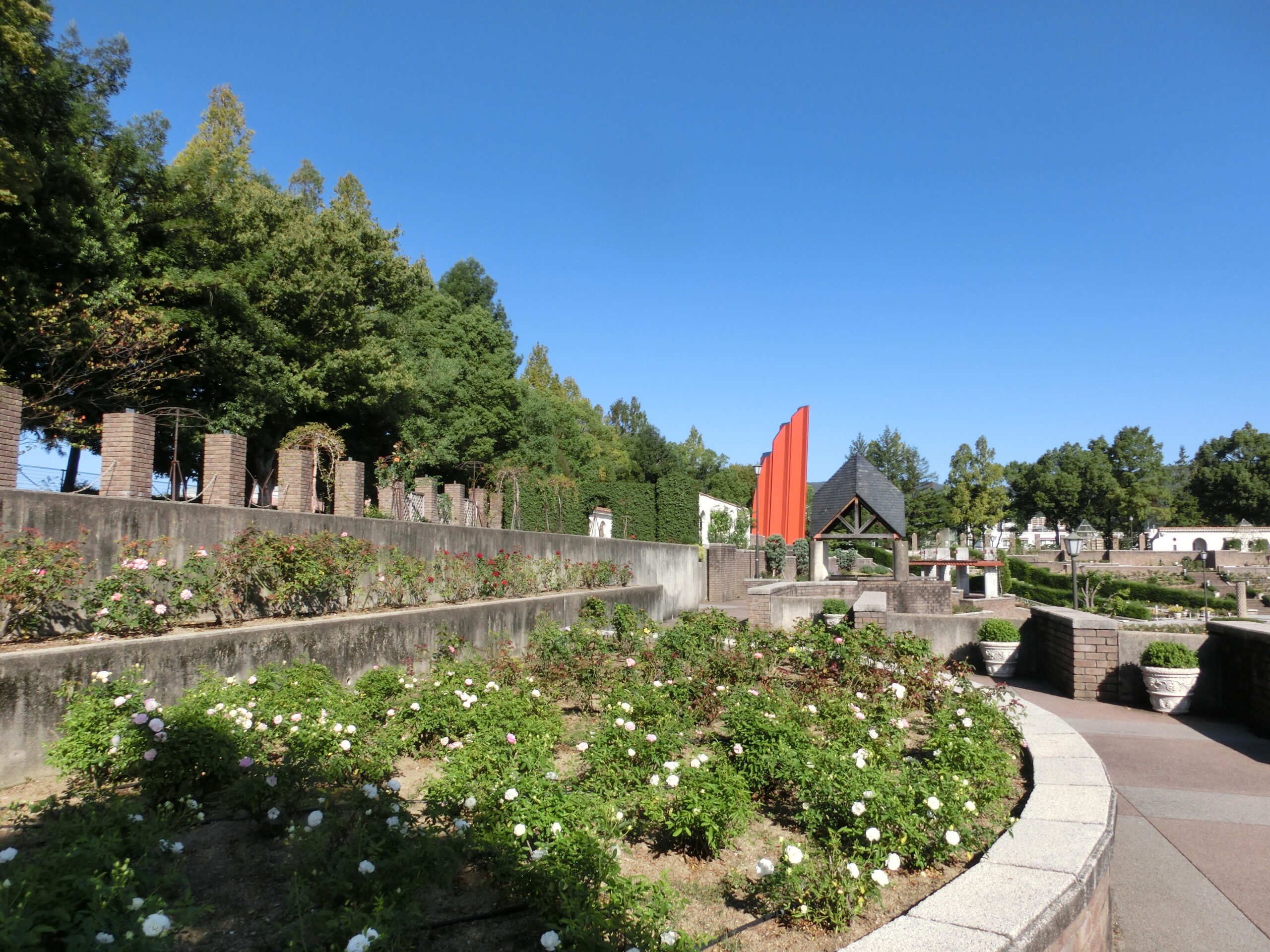 世界のバラ約250種1万本が南欧風のおしゃれな園内一帯に咲き乱れます。伊丹生まれで世界的に名高い「天津乙女(あまつおとめ)」「マダム・ヴィオレ」などが植えられています。開花時期は5~6月と10~11月です。