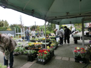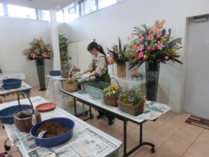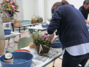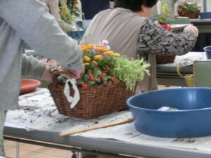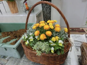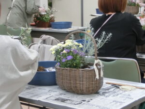 園芸市で好みの花苗を選んで頂き、バスケット鉢に寄せ植えしました。