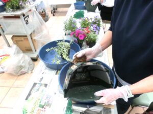 好みの花苗を選んで、ハンギングバスケットに寄せ植えをしました。