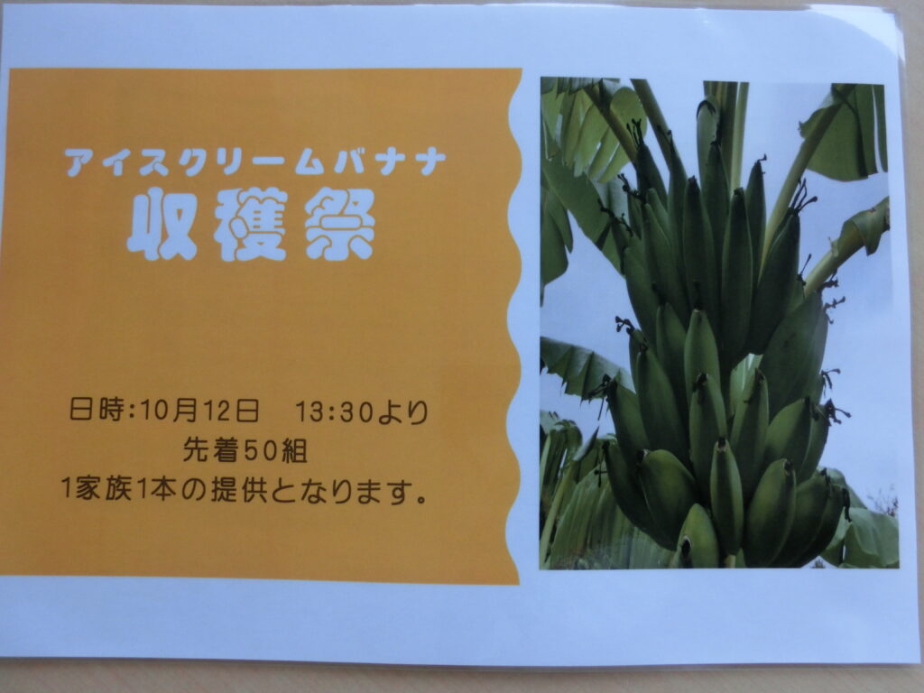 10月12日(日)、13時30分よりアイスクリームバナナ収穫祭を行います。 先着50組、1家族1本の御提供になります。 御了承ください。 皆様のご来館をお待ちしております。
