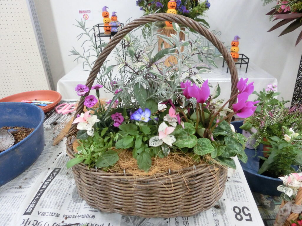 2025.10.26(日) 13:30~ 秋の寄せ植え講習会 園芸市で好みの花苗を選んで頂き、バスケット鉢に寄せ植えしました。