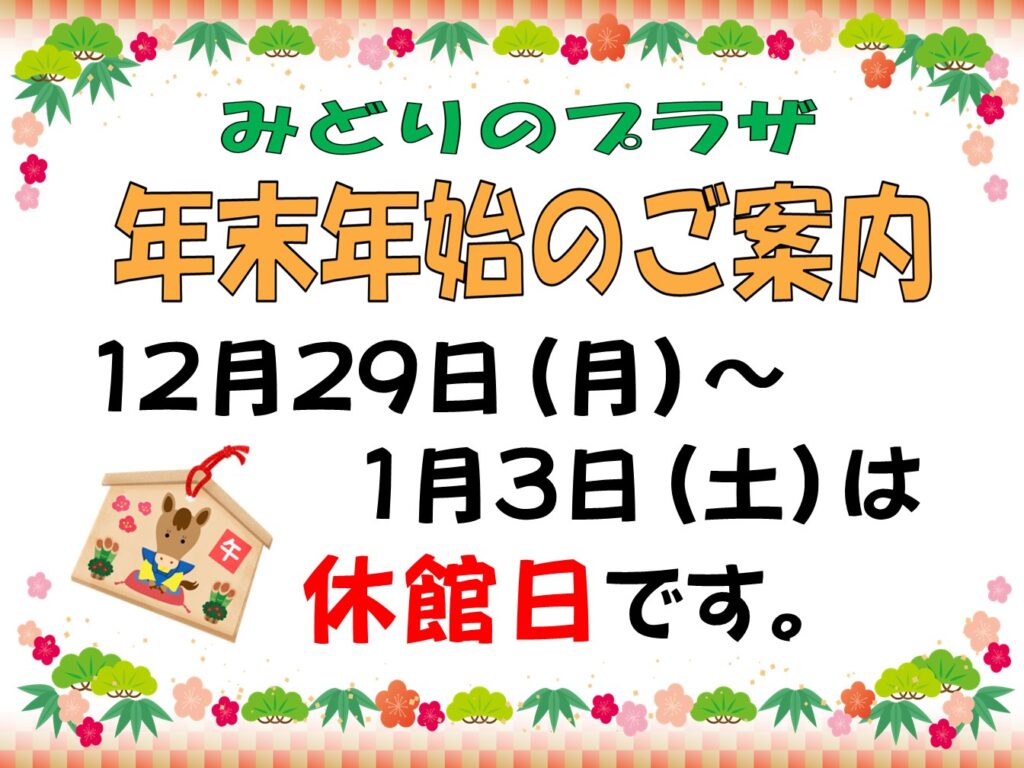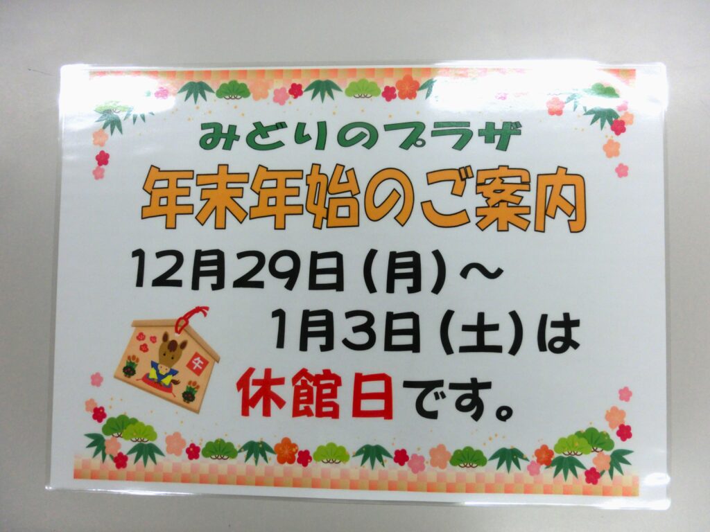 12月29日(月)~1月3日(土)まで、みどりのプラザは休館しております。 新年は1月4日より通常通り開館します。